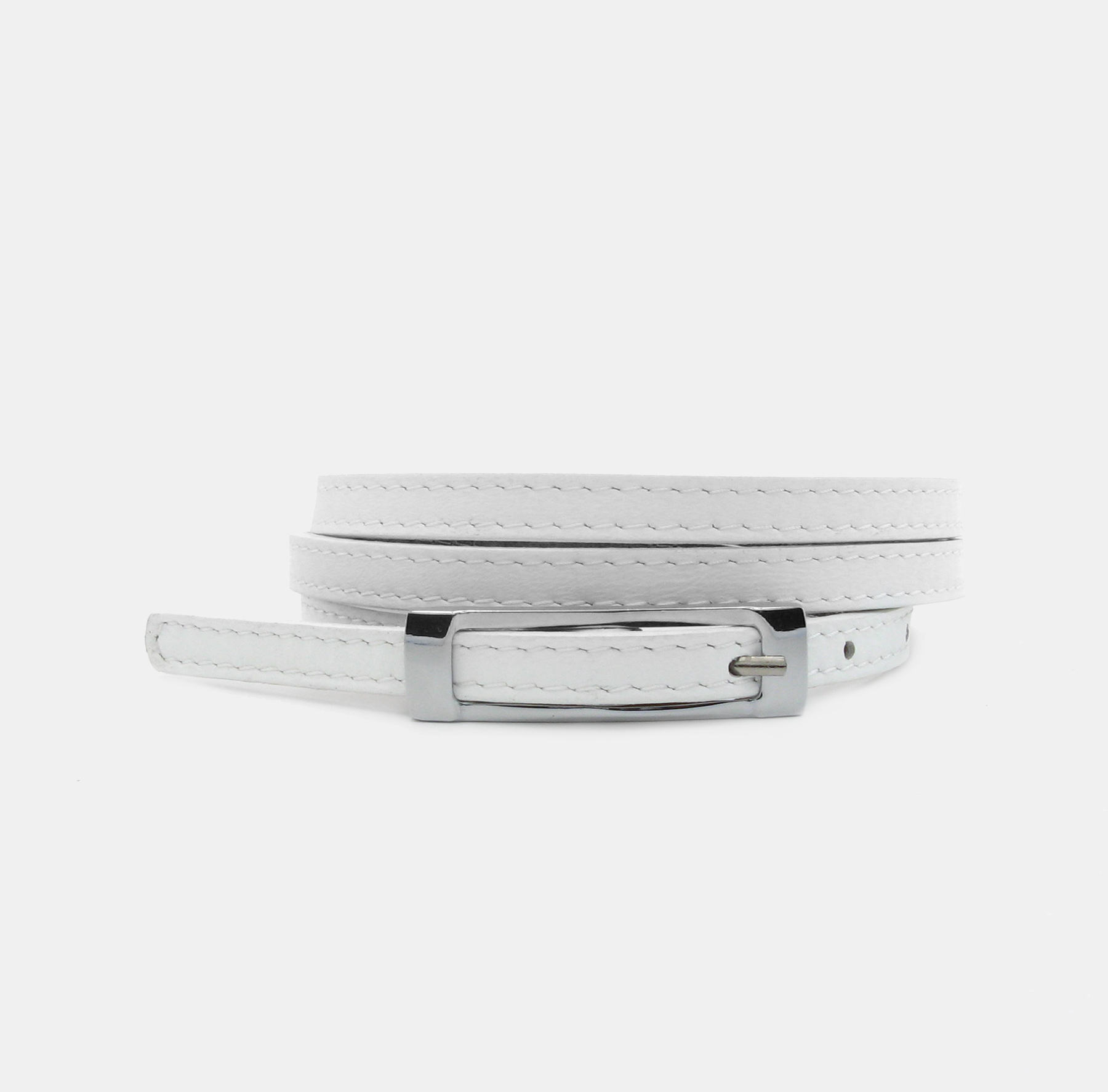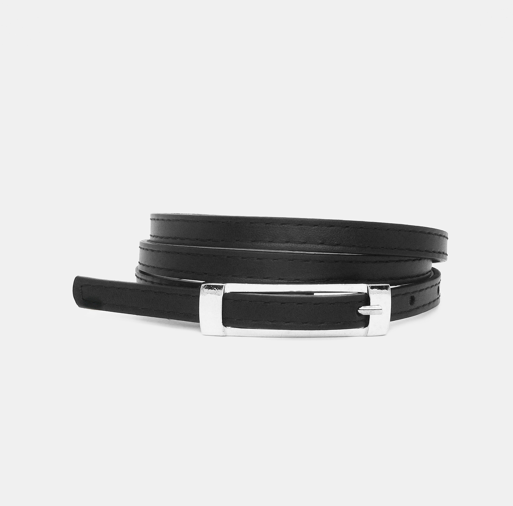 Ez a keskeny szabású, varrott bőr öv igazi stílusikon a ruhatáradban. A letisztult fém csat és a diszkrét megjelenés elegáns hatást kelt, miközben a csillogó felület finom fényjátékkal vonzza a tekintetet. Karcsú vonalvezetése ellenére időtálló – tökéletes választás minden napra vagy különleges alkalmakra.